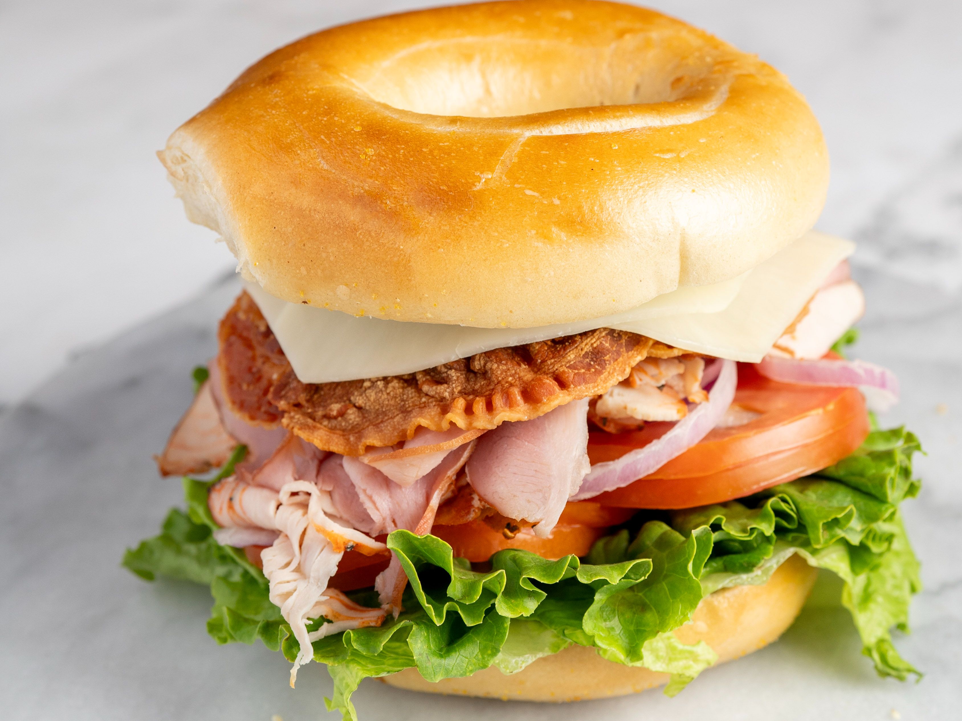 Ham, turkey, bacon, lettuce, tomato, onion, mayo & mustard, choice of cheese on a toasted bagel.