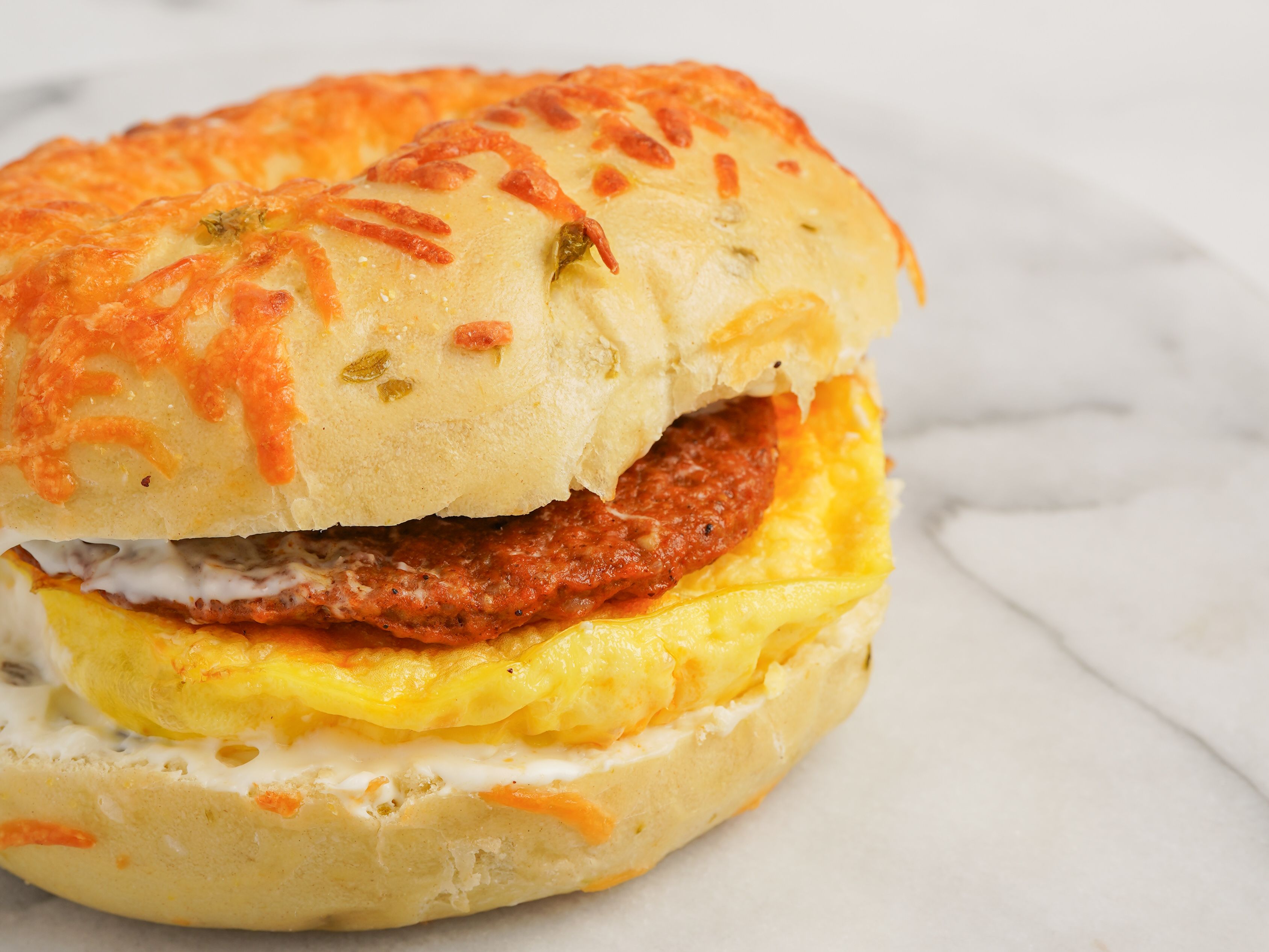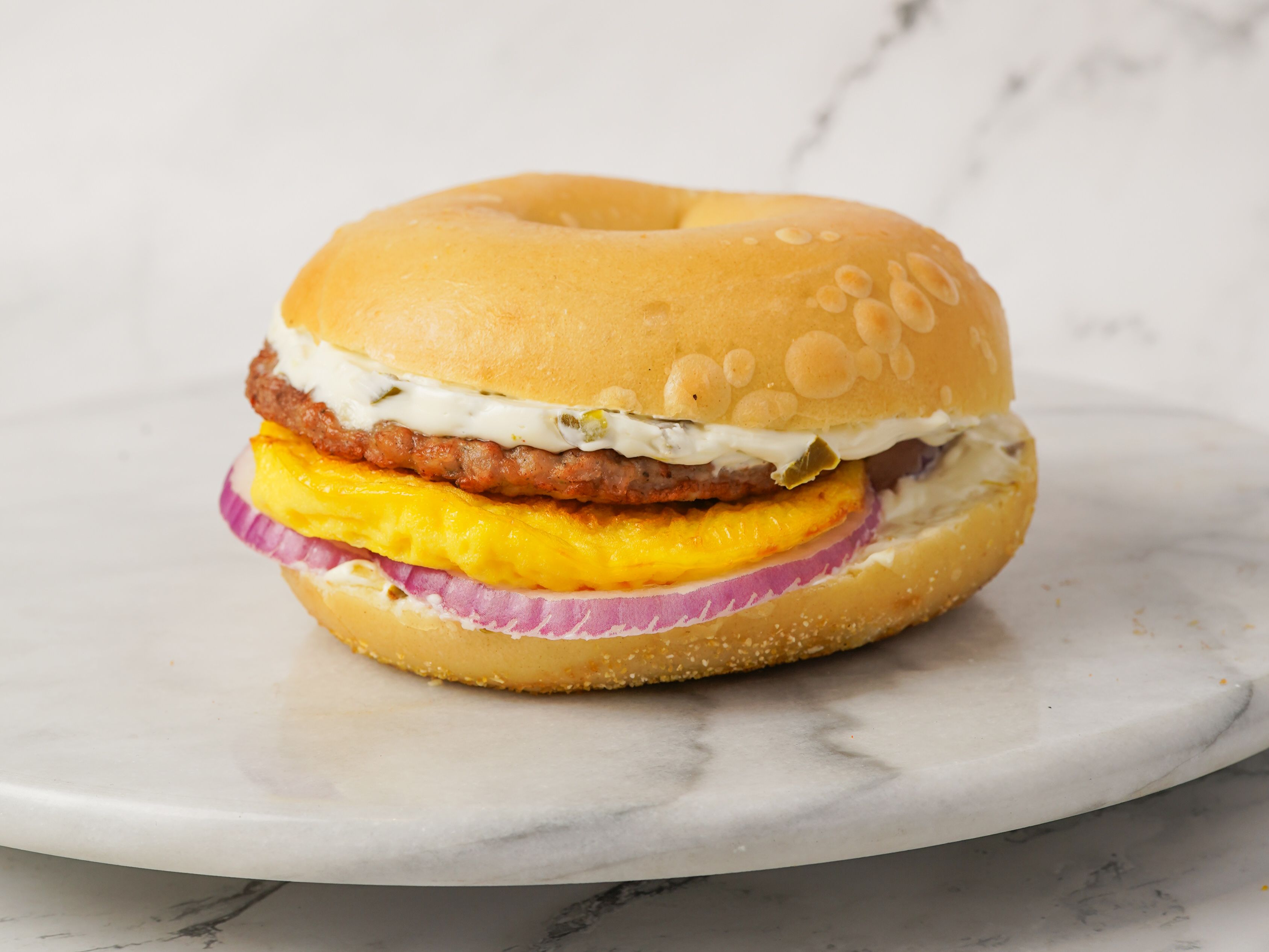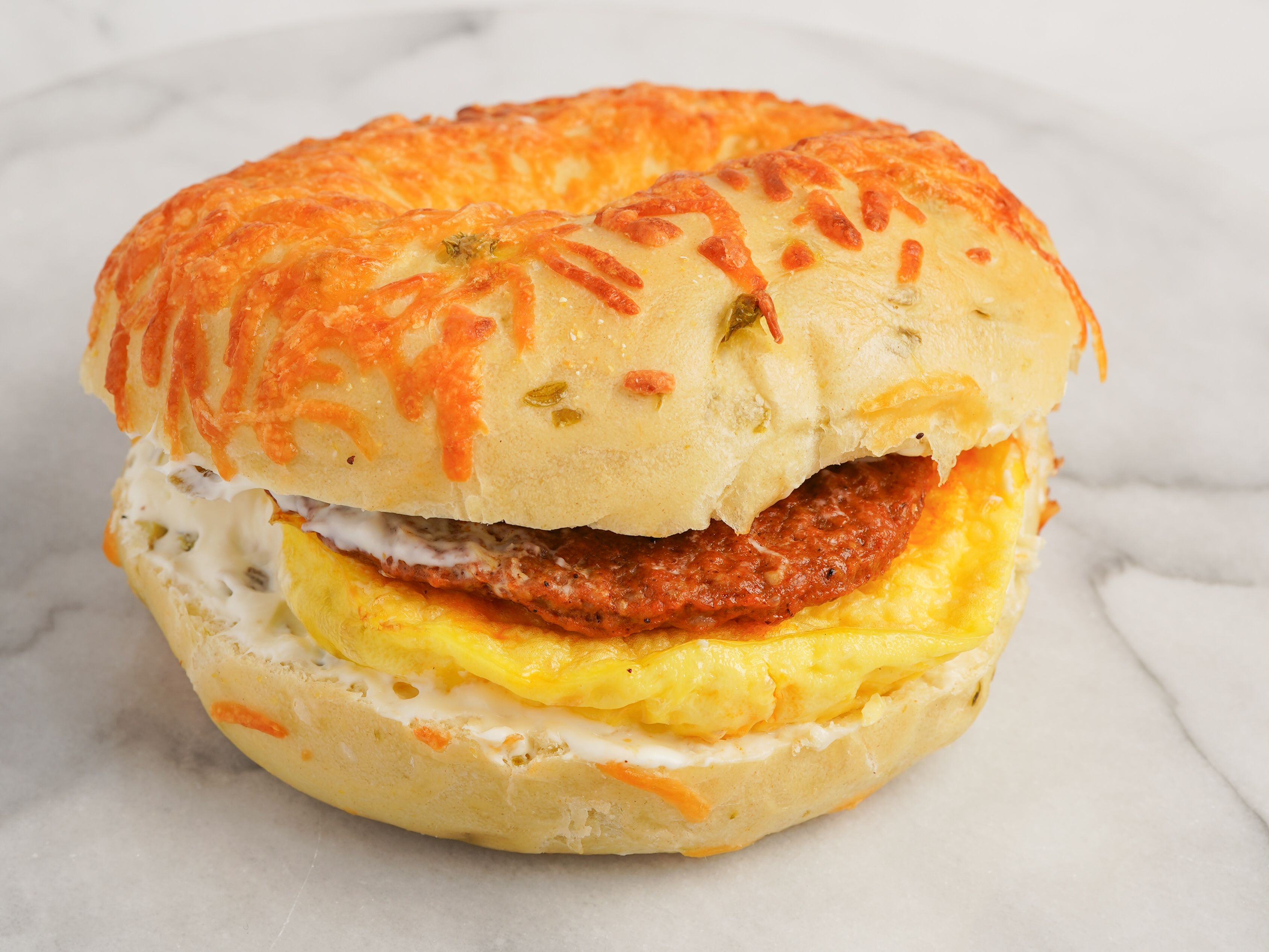 Scrambled eggs, sausage, red onion & jalapeno cream cheese on a toasted bagel.