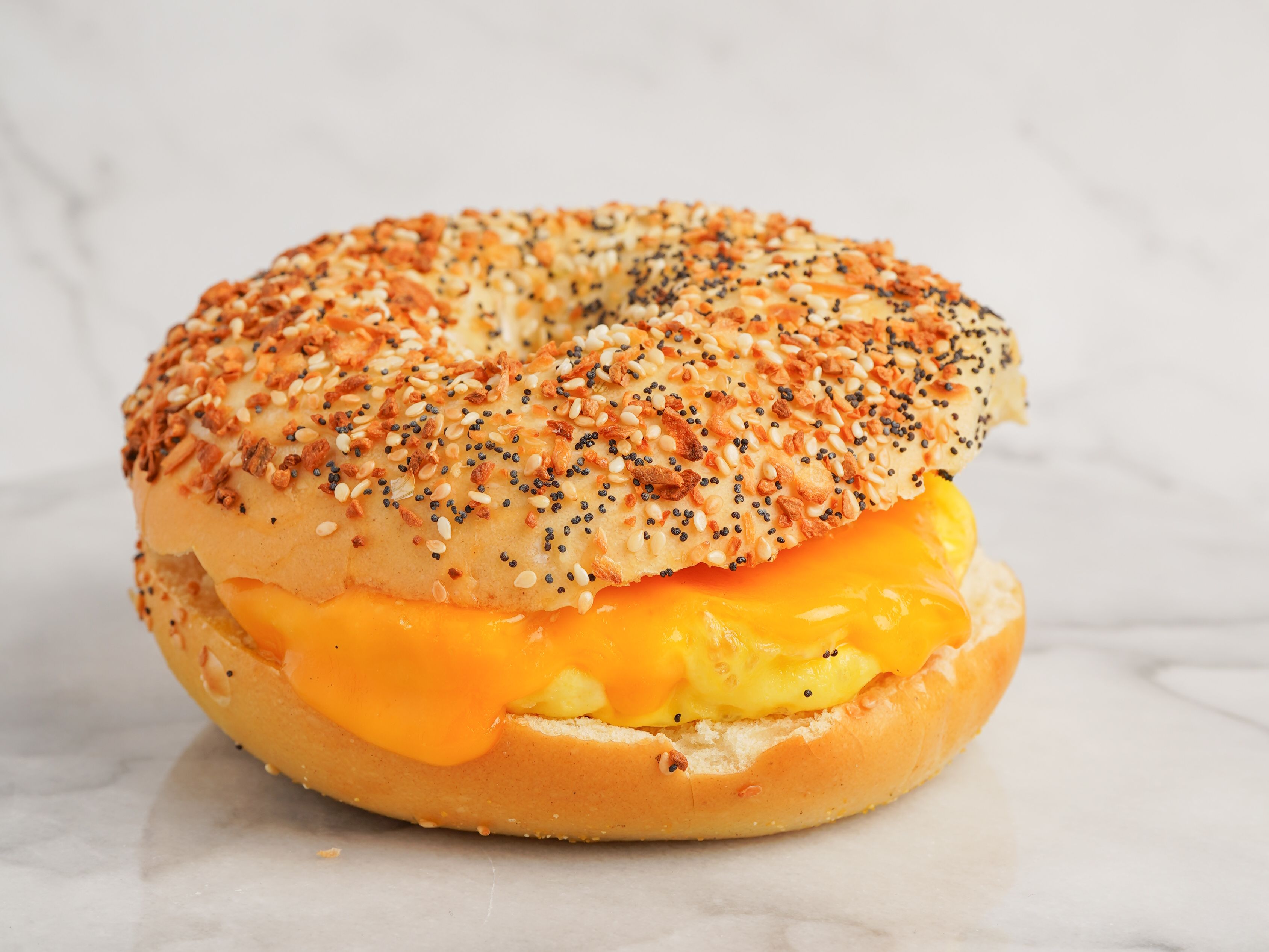 Scrambled eggs, choice of meat, & cheese on a toasted buttered bagel.