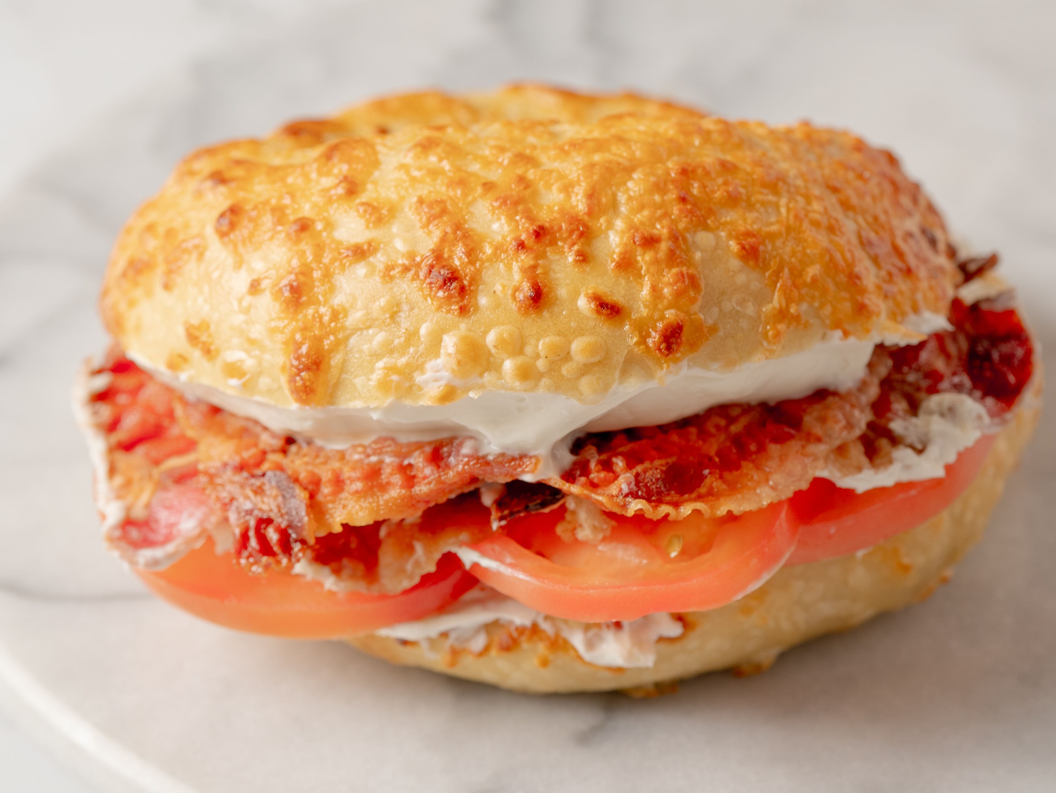 Crispy bacon, tomato, and plain cream cheese on a toasted bagel.