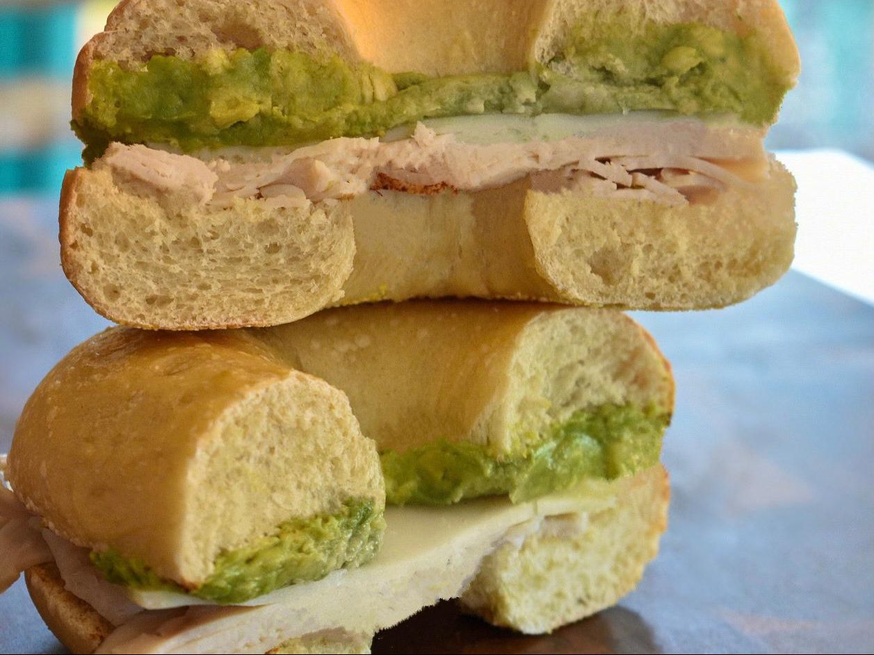 Turkey, bacon, avocado, provolone cheese, lettuce, & tomato on a toasted bagel.