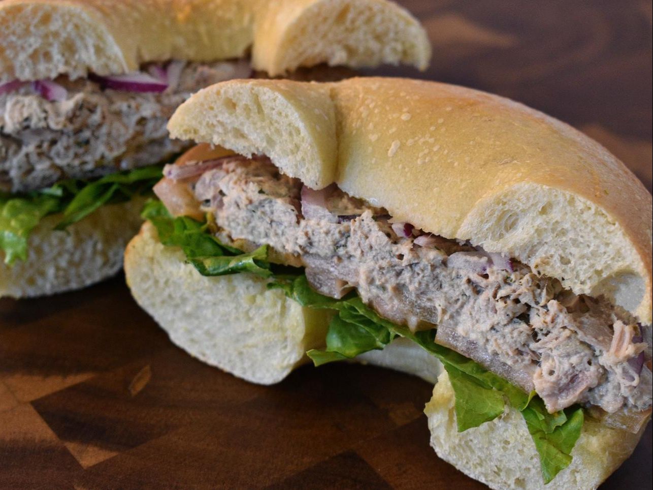 Tuna salad mix, lettuce, tomato, onion, cucumbers, on a toasted bagel.