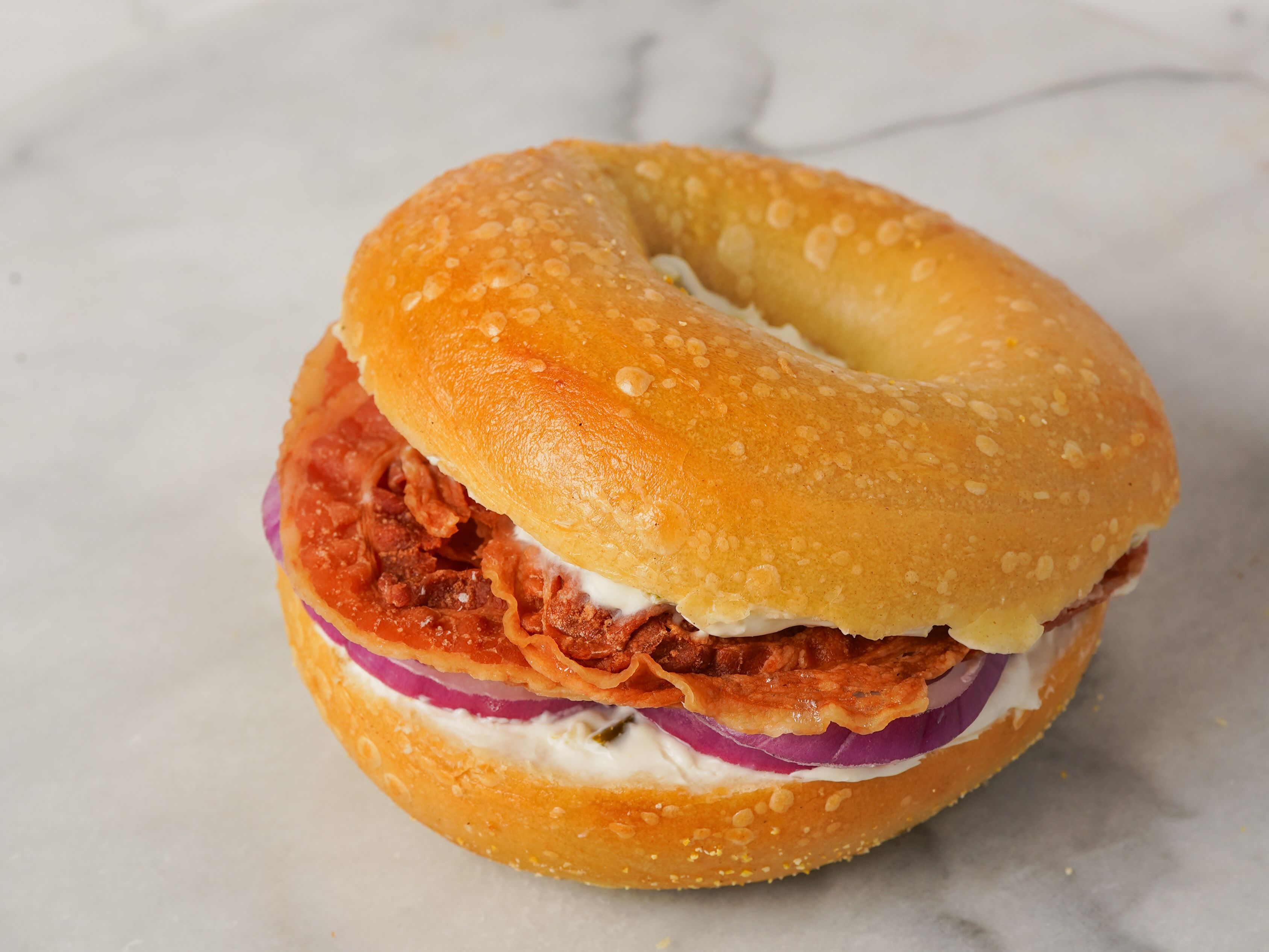Crispy bacon, onion, jalapeno cream cheese on a toasted bagel.