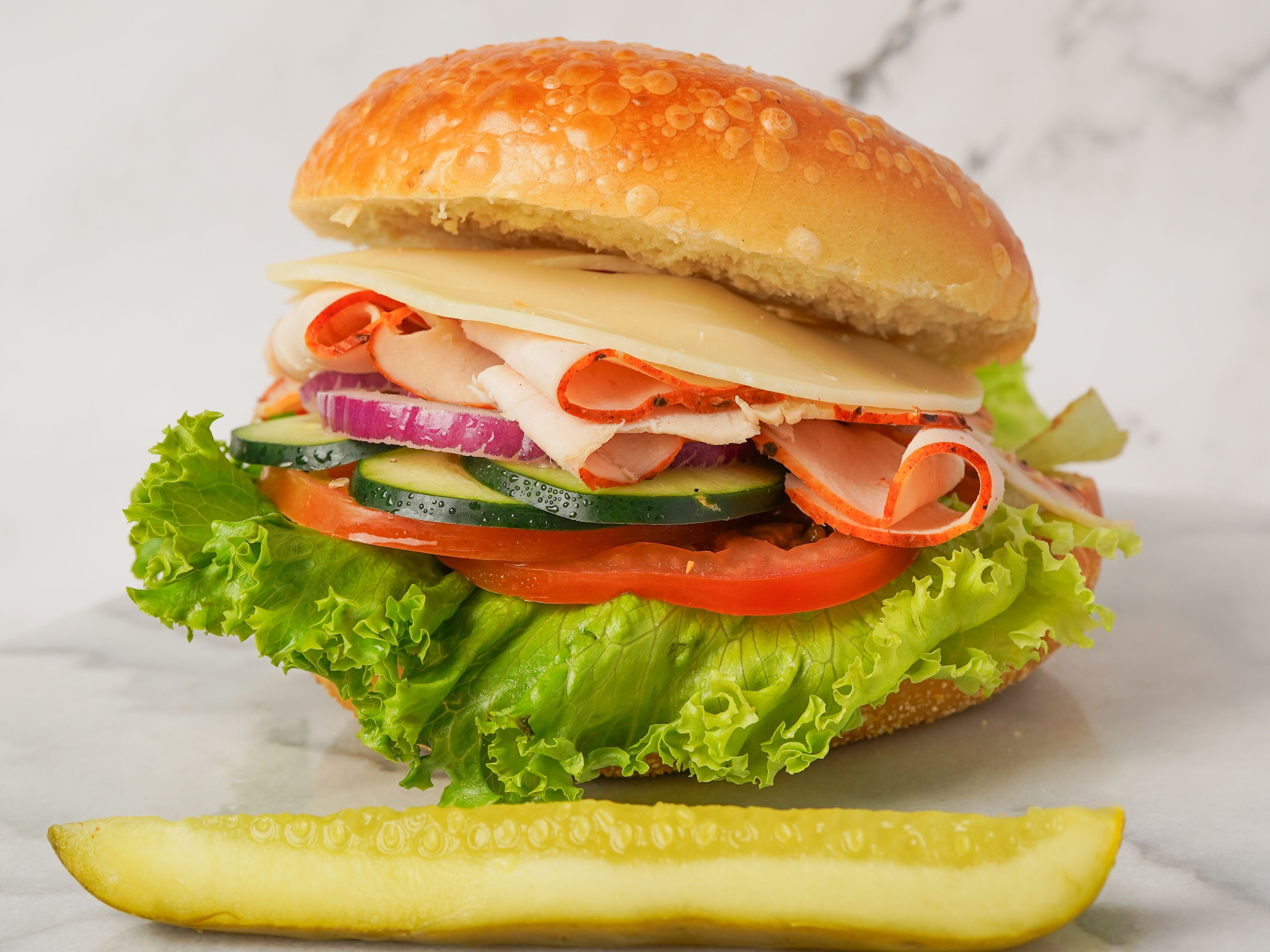 Turkey, lettuce, tomato, onion, mayo, mustard, choice of cheese, on a toasted bagel.