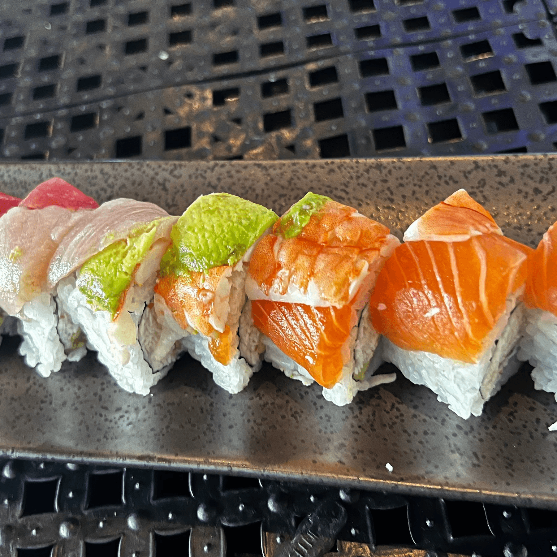 Smoked salmon cream cheese avocado crab stick and jalapeño twice tempura'd