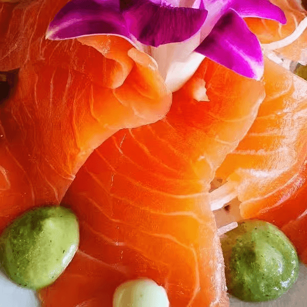 These foods are served undercooked or raw. Consuming raw or undercooked food may increase your risk of foodborne illness. Fresh salmon served in a very spicy sriracha, chopped wasabi and togarashi ponzu