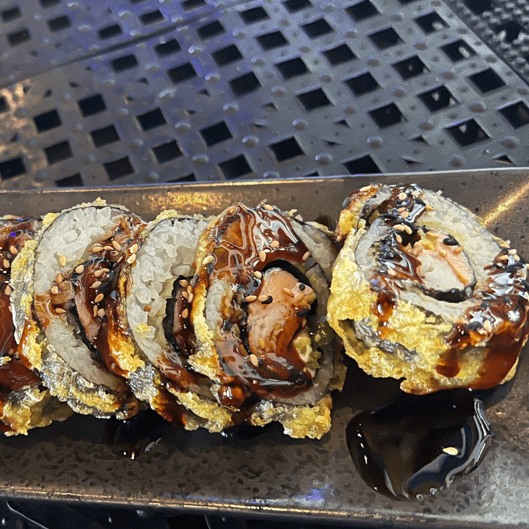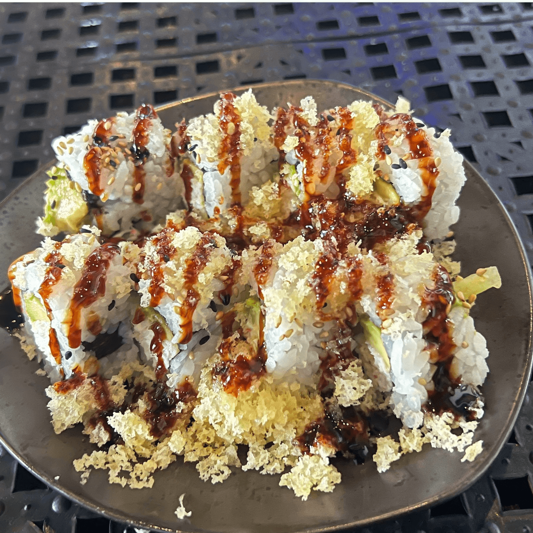 Eel, avocado, spicy crab, jalapeño and cream cheese, served tempura style and topped with a sweet soy glaze
