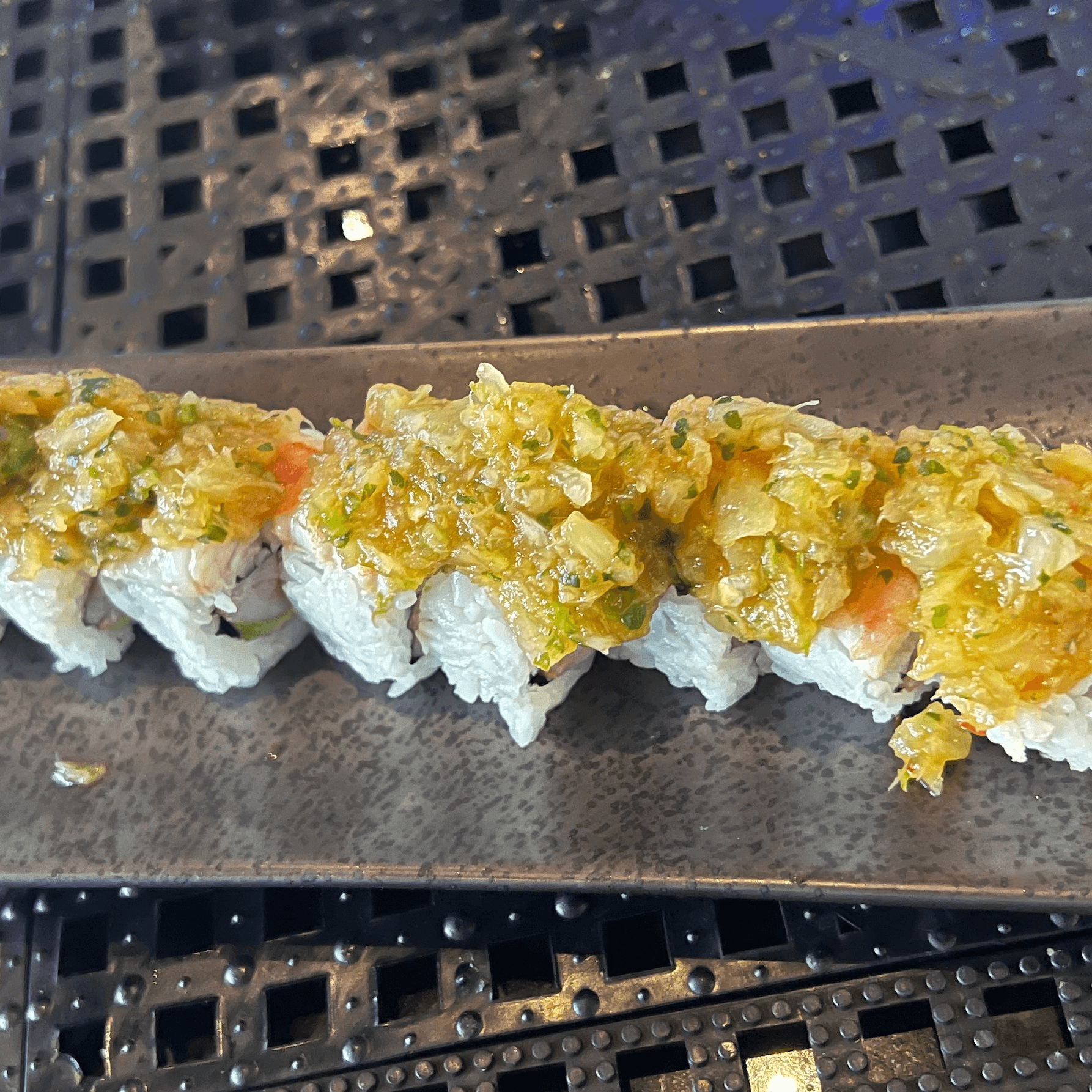 Panko crusted shrimp, spicy crab and avocado topped with shrimp and pineapple salsa