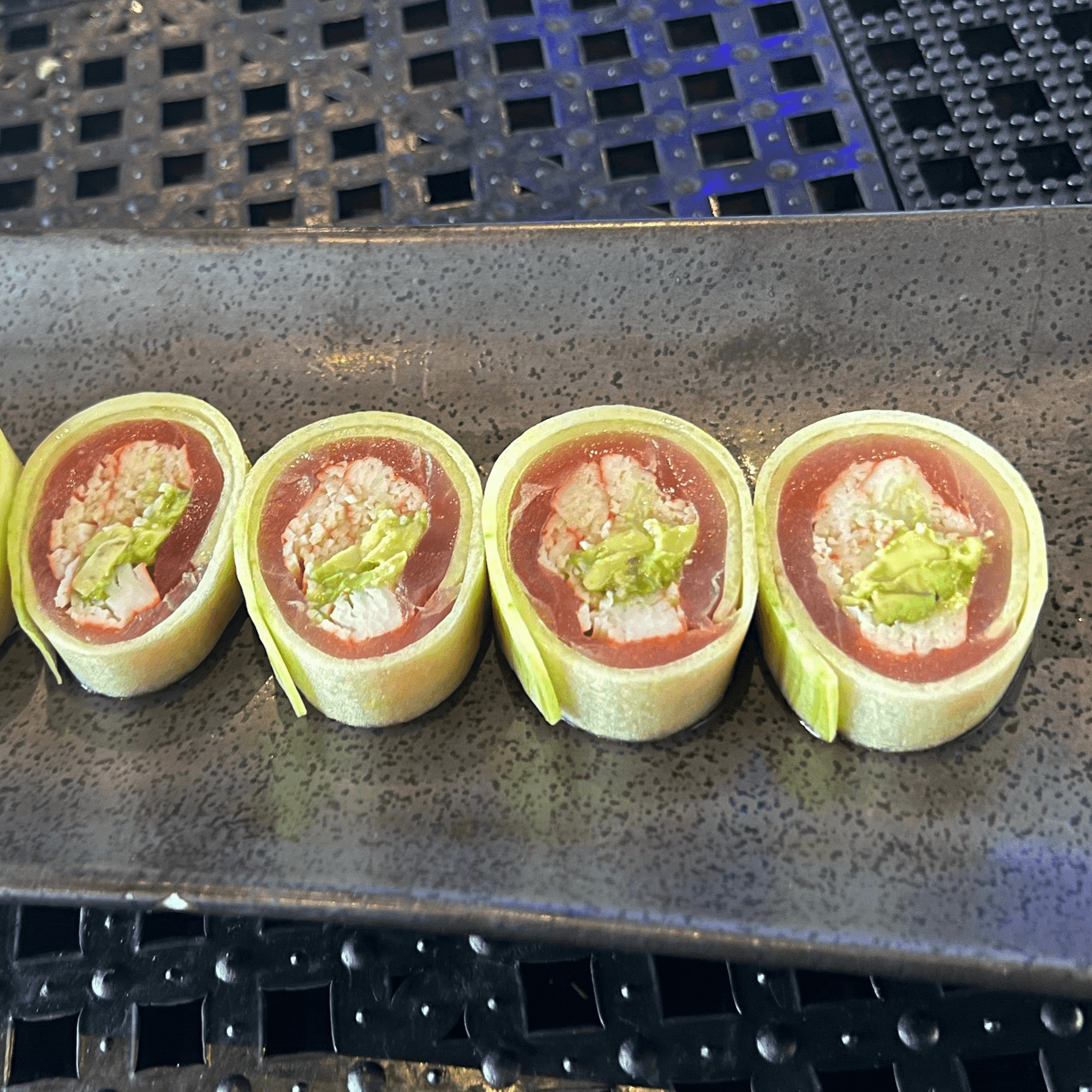 These foods are served undercooked or raw. Consuming raw or undercooked food may increase your risk of foodborne illness. Tuna, krab and avocado wrapped with cucumber and topped with ponzu dressing