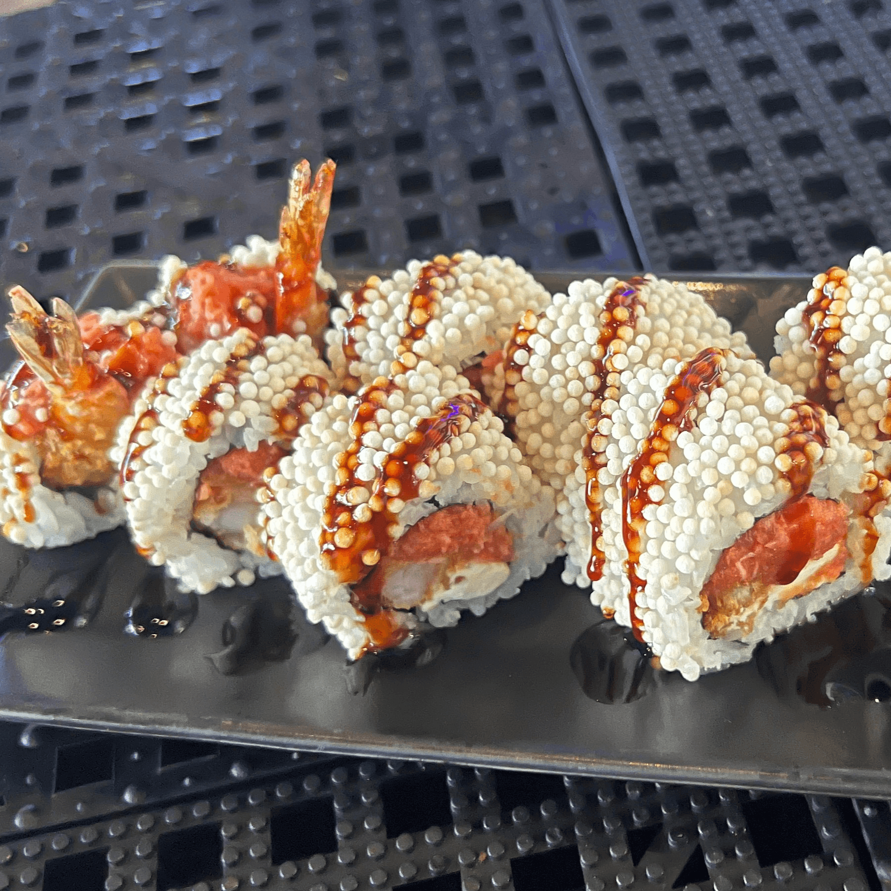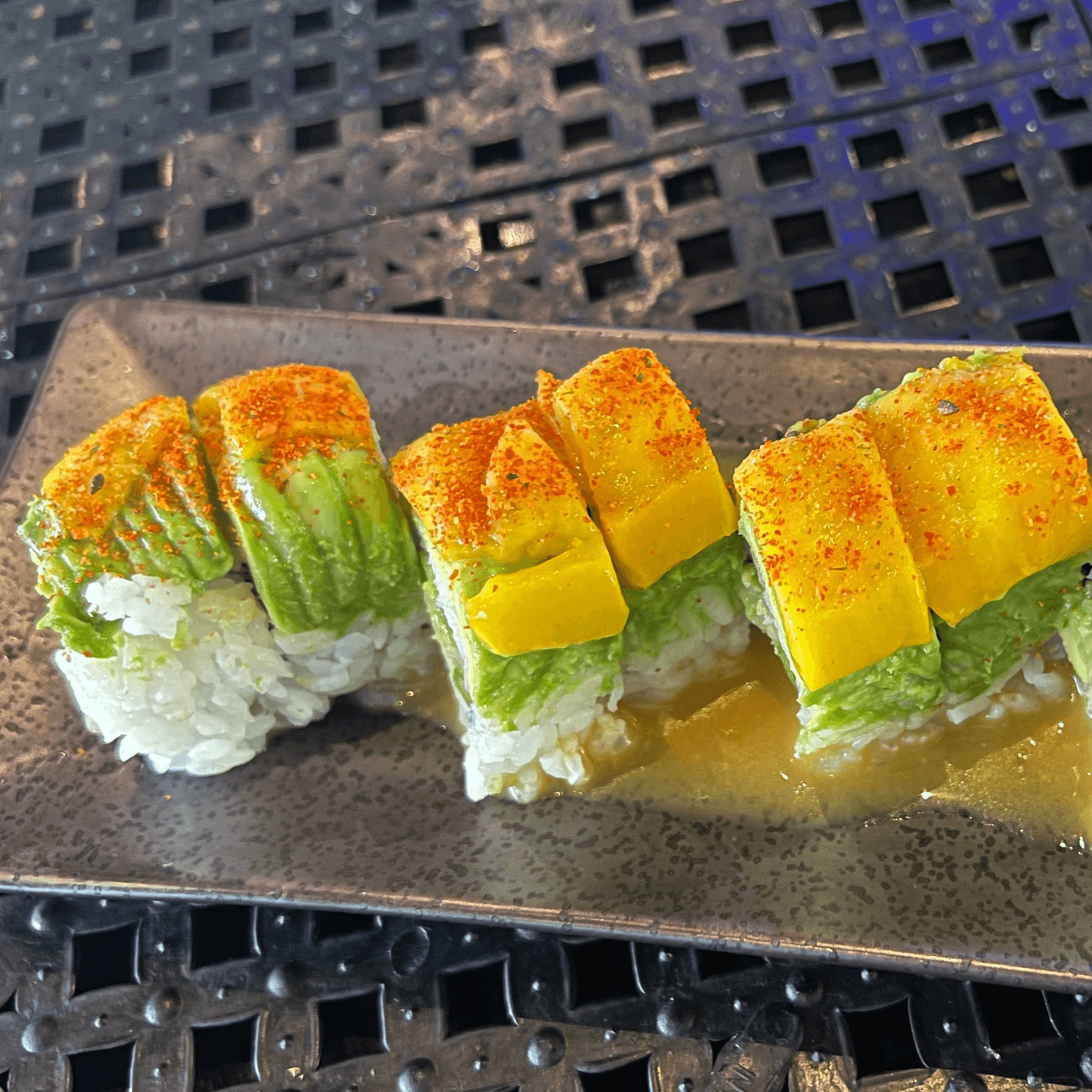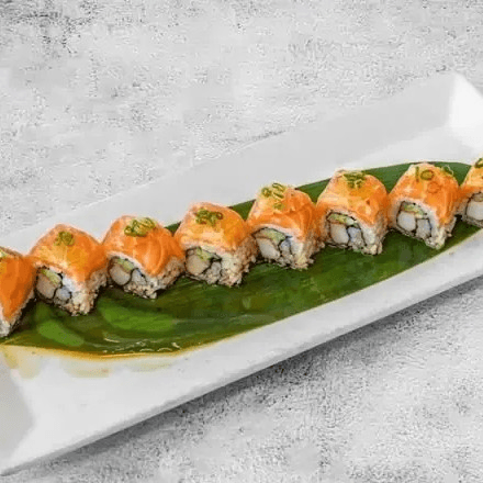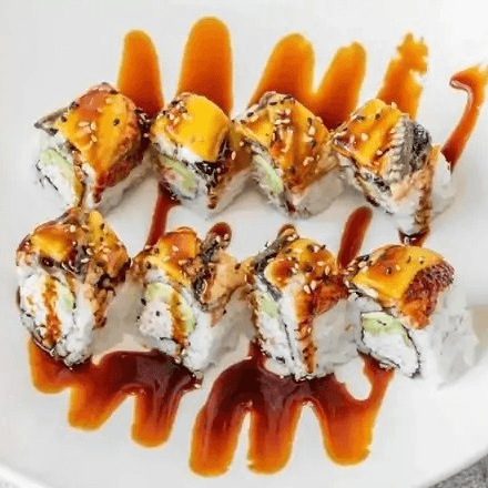 California roll topped with freshwater eel, sliced mango and sweet soy glaze