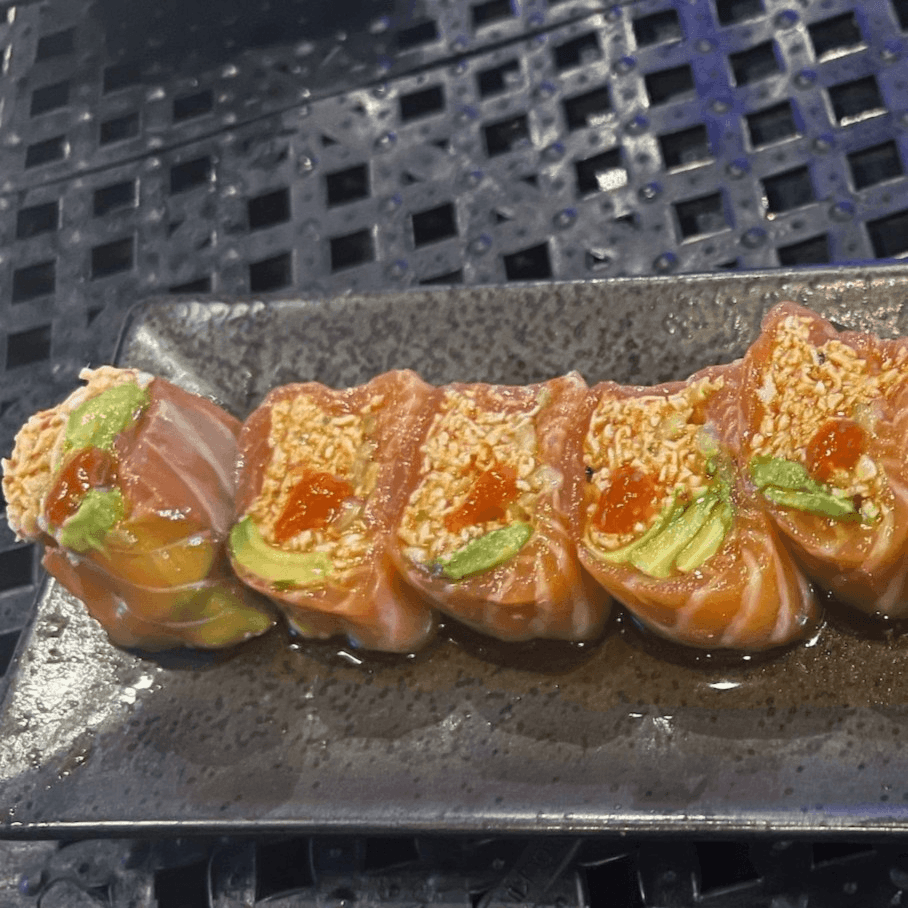 These foods are served undercooked or raw. Consuming raw or undercooked food may increase your risk of foodborne illness. Spicy krab, avocado and cucumber rolled in fresh salmon, topped with a touch of sriracha and ponzu sauce