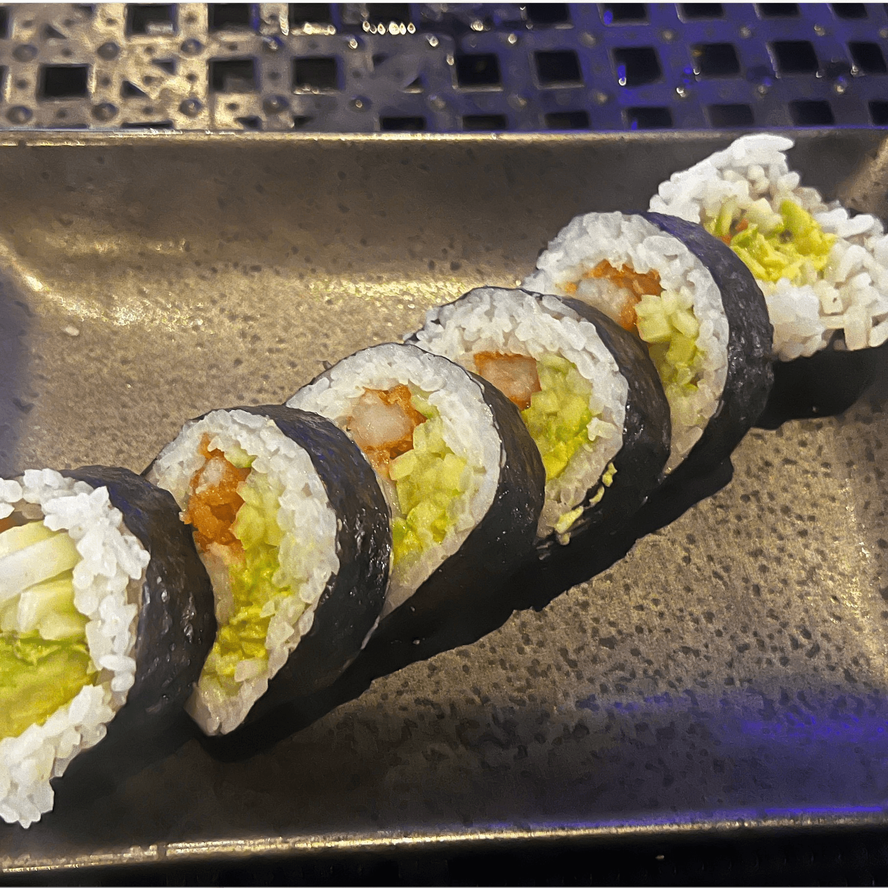 These foods are served undercooked or raw. Consuming raw or undercooked food may increase your risk of foodborne illness. Shrimp tempura, spicy tuna, cucumber and avocado wrapped in soy paper