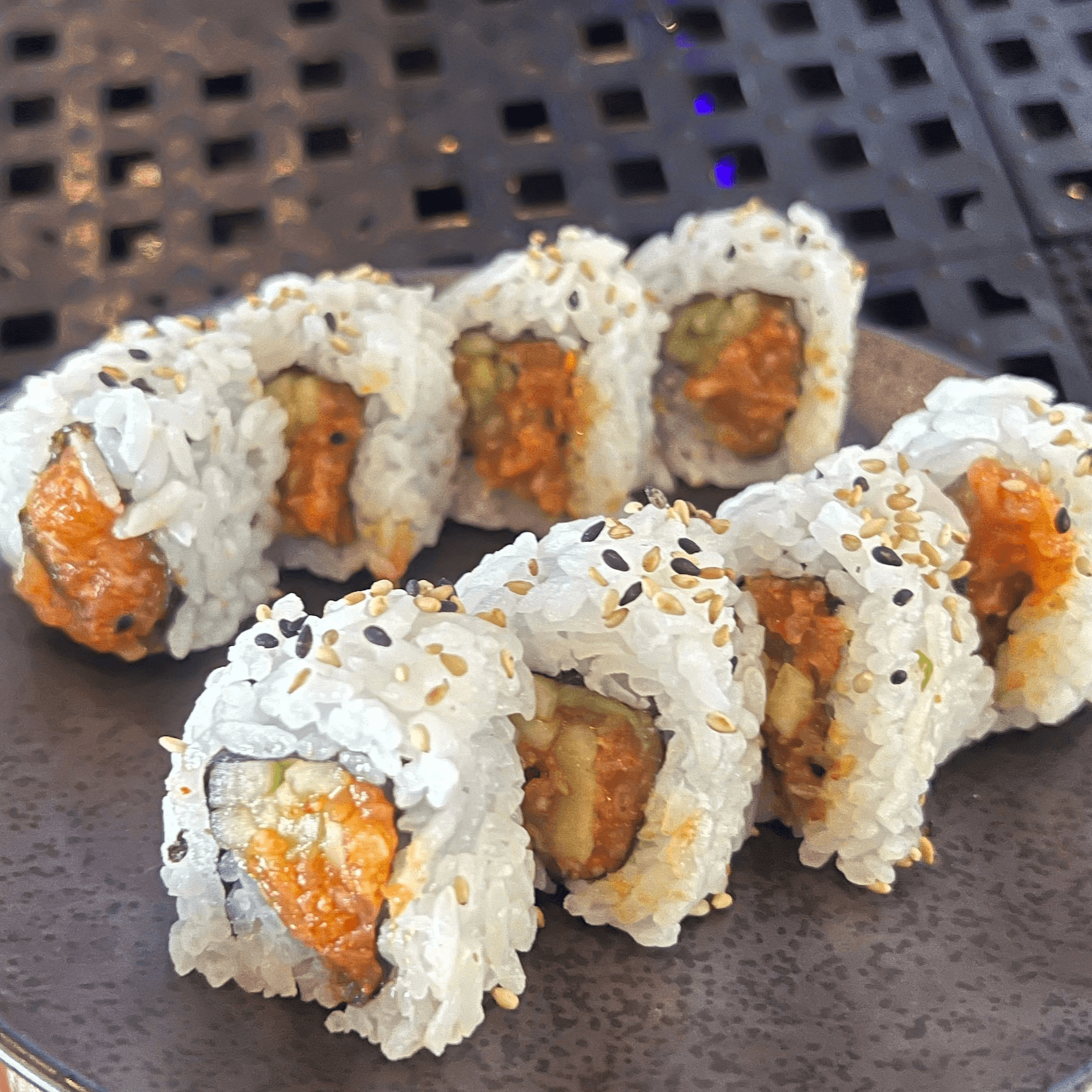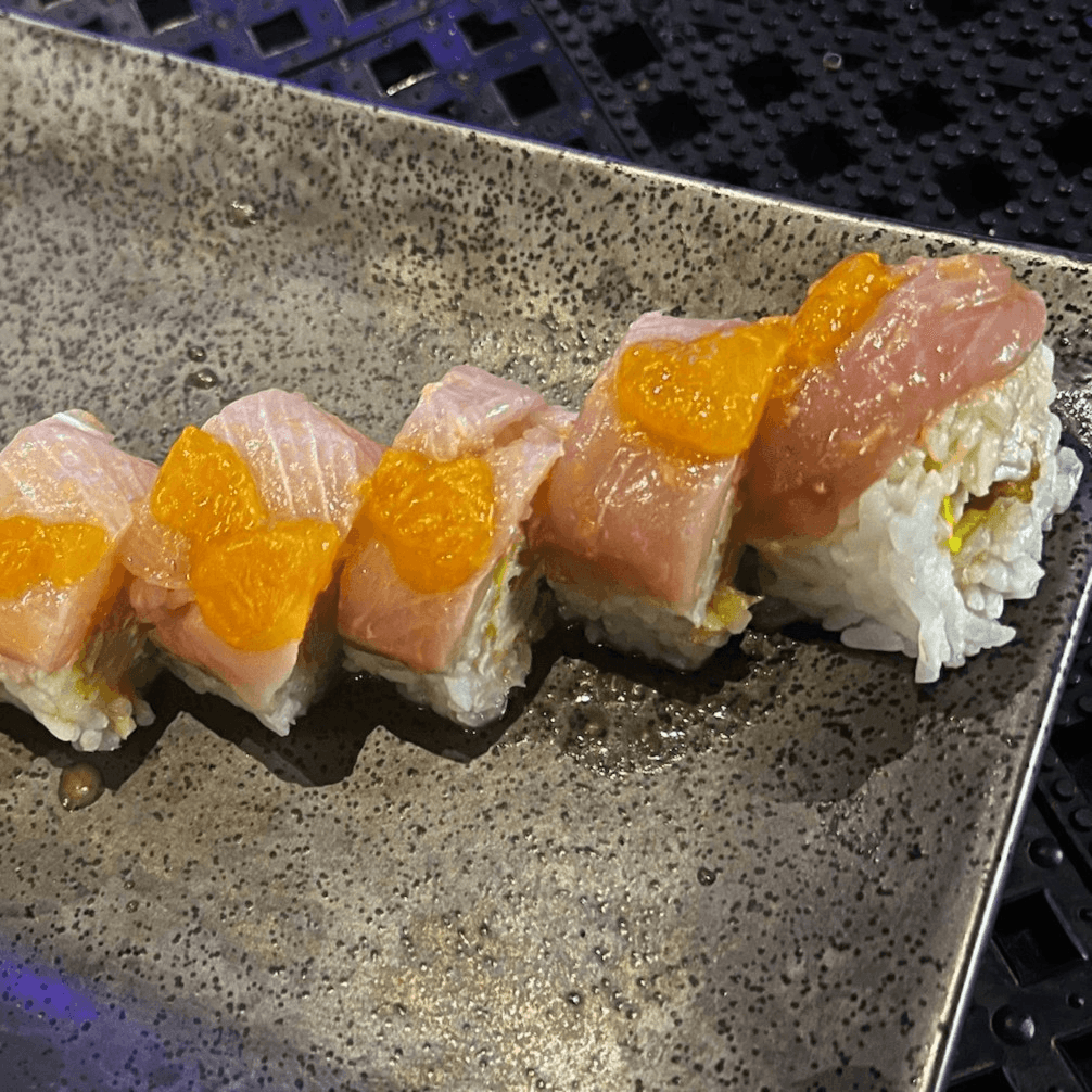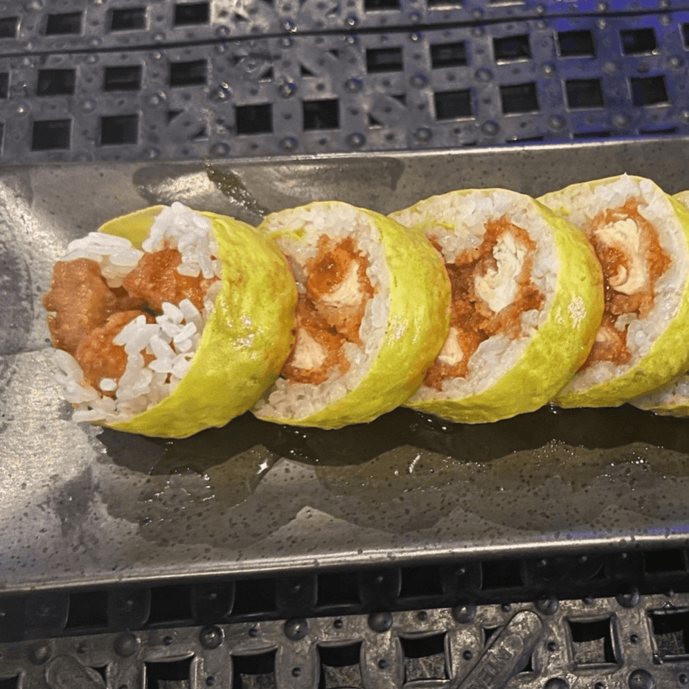 These foods are served undercooked or raw. Consuming raw or undercooked food may increase your risk of foodborne illness. Shrimp tempura, spicy tuna, krab mix, cream cheese, yellowtail, mandarin oranges, and orange ginger vinaigrette, wrapped in soy paper