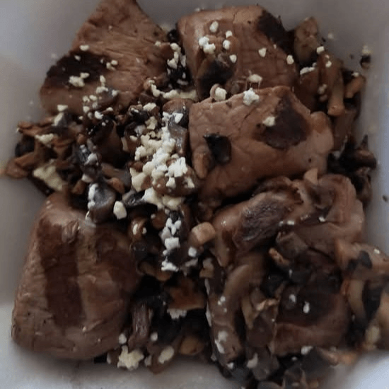 Seared filet mignon medallions topped with sautéed mushrooms & bleu cheese on request