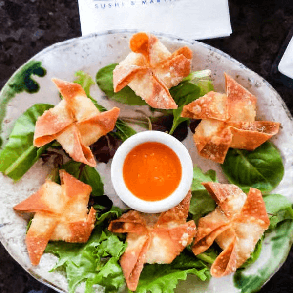 Crispy wontons, stuffed with krab, cream cheese & onions, apple plum sauce