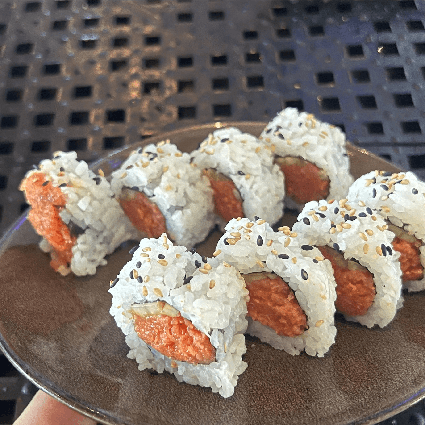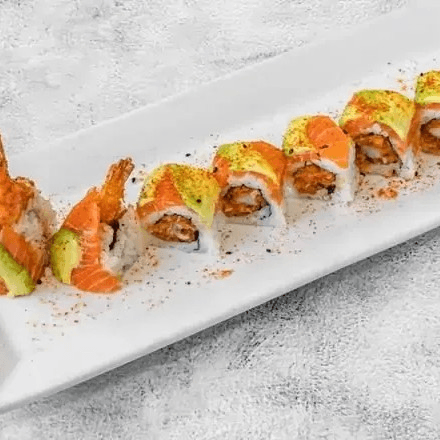 Spicy salmon and panko crusted shrimp inside, topped with sashimi salmon, avocado, fresh squeezed lemon juice and togarashi