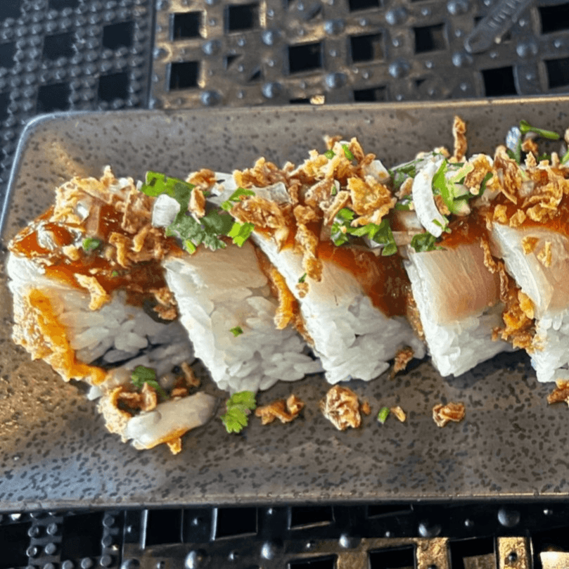 Spicy crab mix, panko shrimp, topped with fresh tuna sashimi, jalapeño wheels, onion chips & rock shrimp sauce