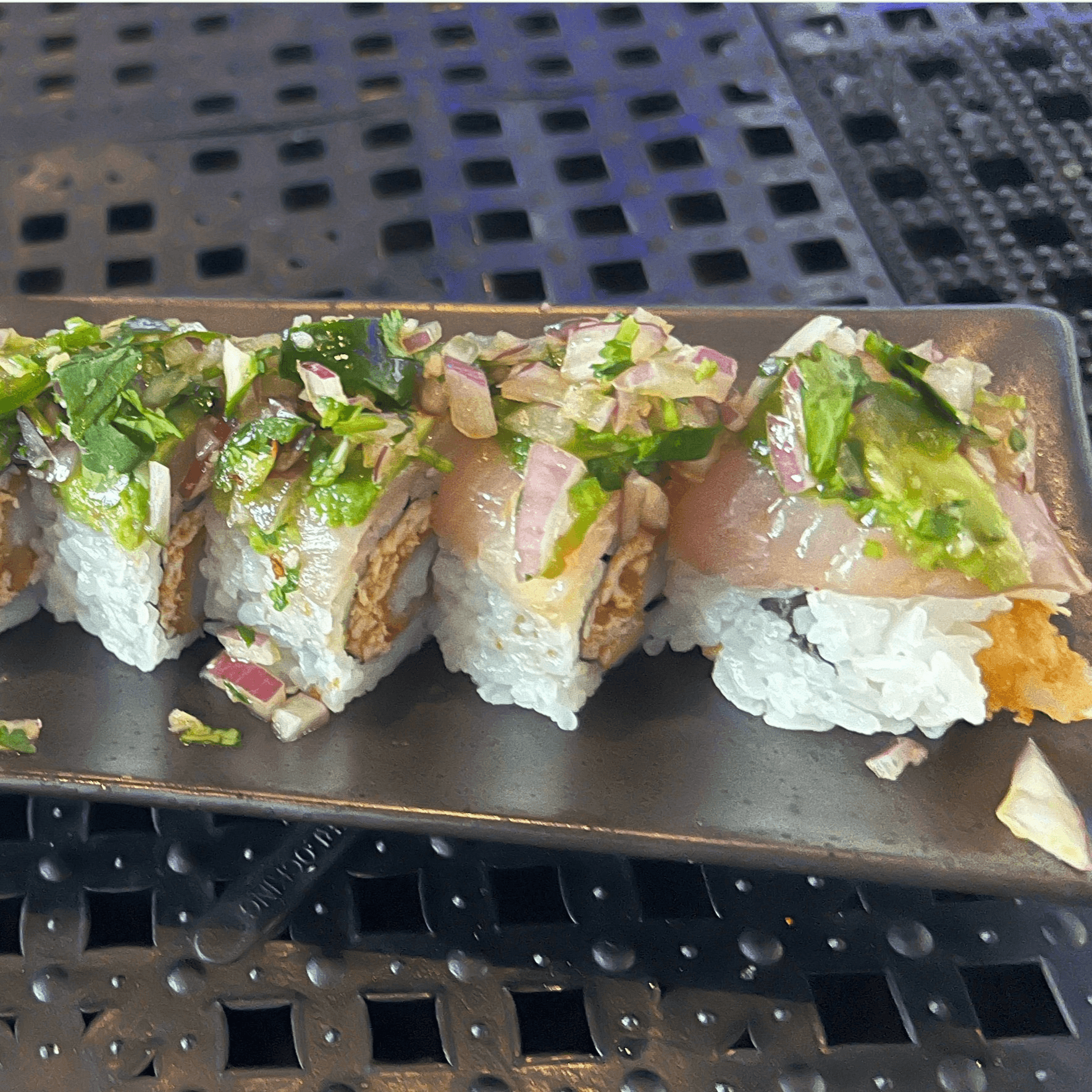 Panko crusted shrimp & spicy crab topped with yellowtail, avocado & cilantro, onion & jalapeño