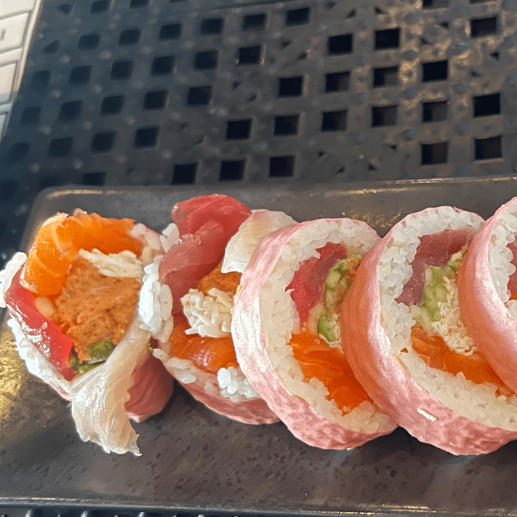 These foods are served undercooked or raw. Consuming raw or undercooked food may increase your risk of foodborne illness. Sashimi tuna, yellowtail and salmon with spicy tuna, crab mix, avocado and cucumber, wrapped in pink soy paper