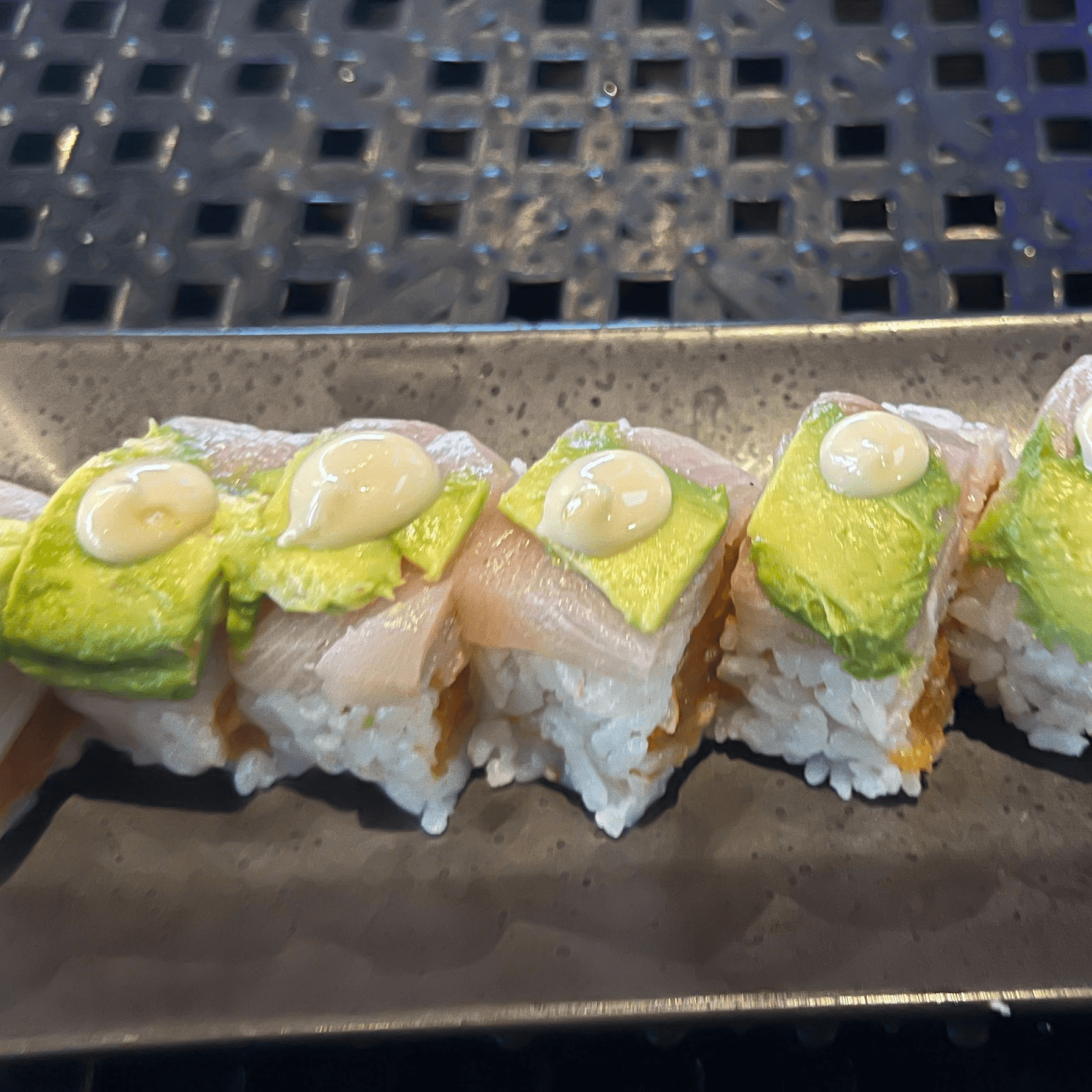 Shrimp tempura, jalapeño and cucumber topped with avocado, seared tuna and spicy mayo